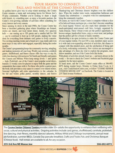 Today, the 55+ Fall and Winter Seniors Guide was distributed by the Moose Jaw Express. This is an absolutely perfect description of what is happening at the Cosmo Centre. Thank you to Aaron Walker for writing such an incredible piece 🙂