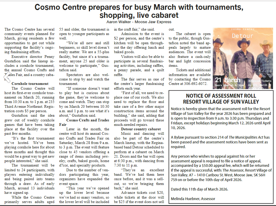 Thanks to Aaron Walker from Moose Jaw Express for this amazing article highlighting March 2026’s upcoming events. It’s a great month ahead. Hope to see you around 🙂