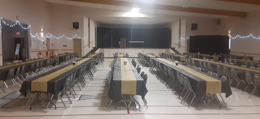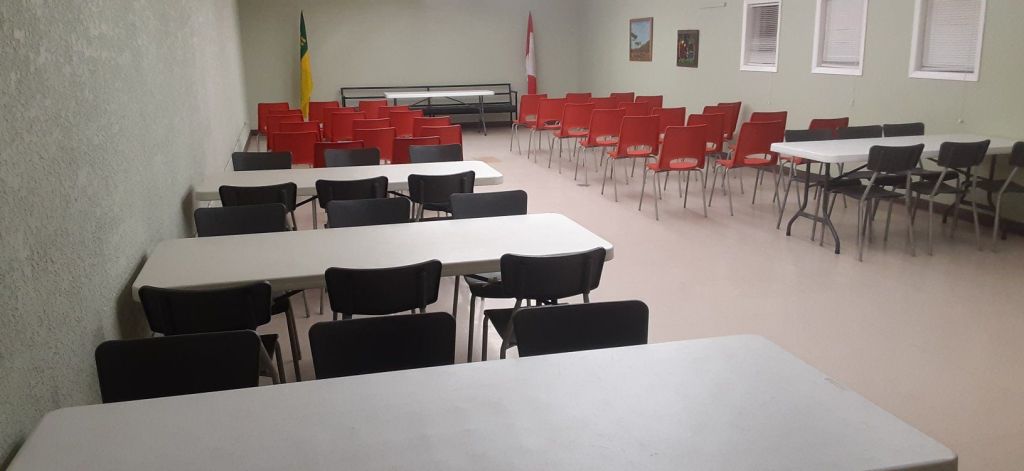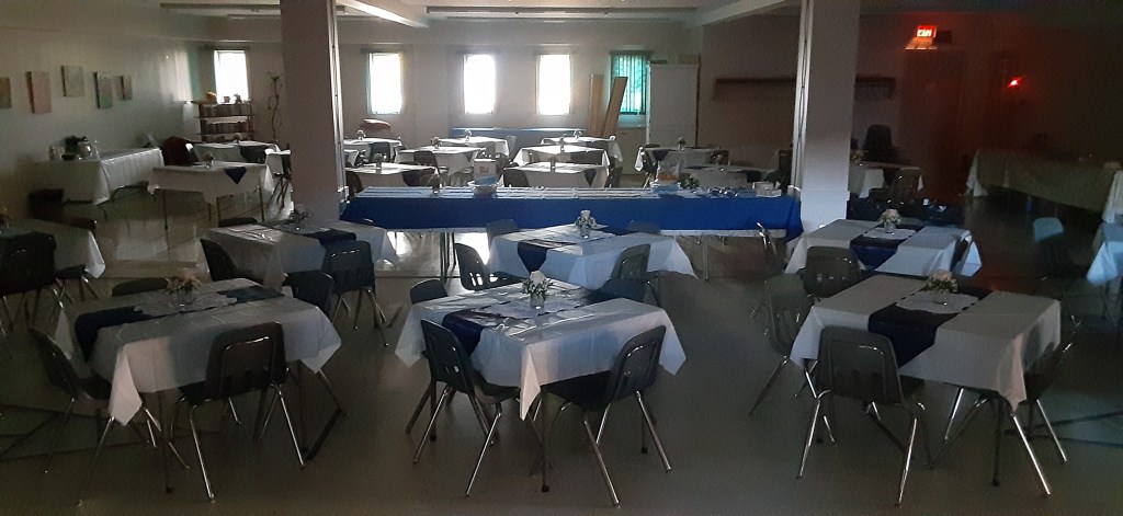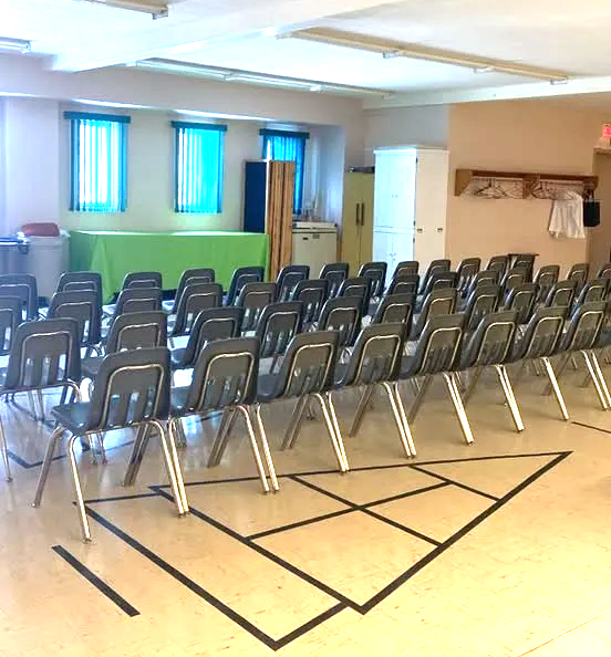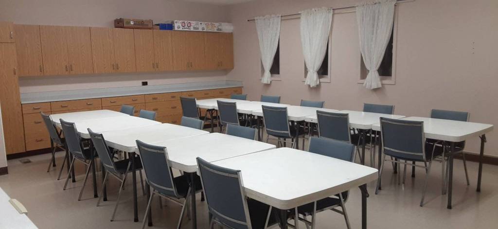 Meeting Room – the room is 20′ x 40′ and is in the lower level of the large hall and accommodates up to 80 chairs. NOTE: At this time, this room is NOT a barrier free meeting room as there are four steps going down to the room. They are solid stairs with a strong hand rail. This room can be used as a monthly rental or one time rental.