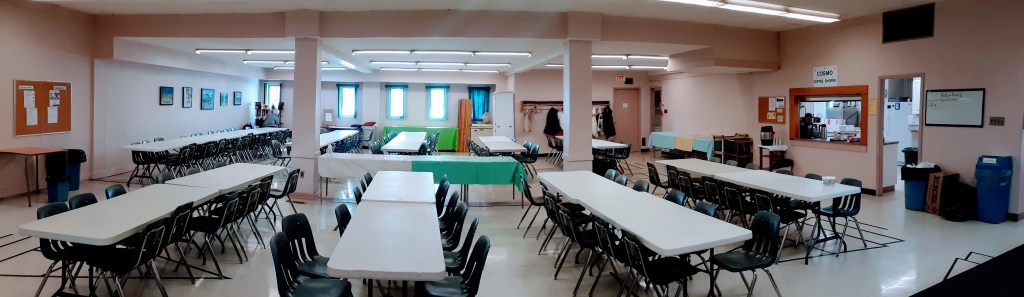 Craft Room/Also used for meetings – 22’ x 21’ is in the large hall kitchen space. It is a kitchen and has tables, chairs with sink, coffee and tea pots, sink, etc.